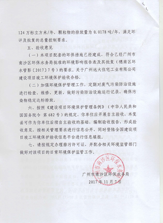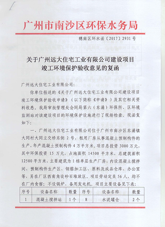 關(guān)于廣州遠(yuǎn)大住宅工業(yè)有限公司建設(shè)項(xiàng)目竣工環(huán)境保護(hù)驗(yàn)收意見的復(fù)函