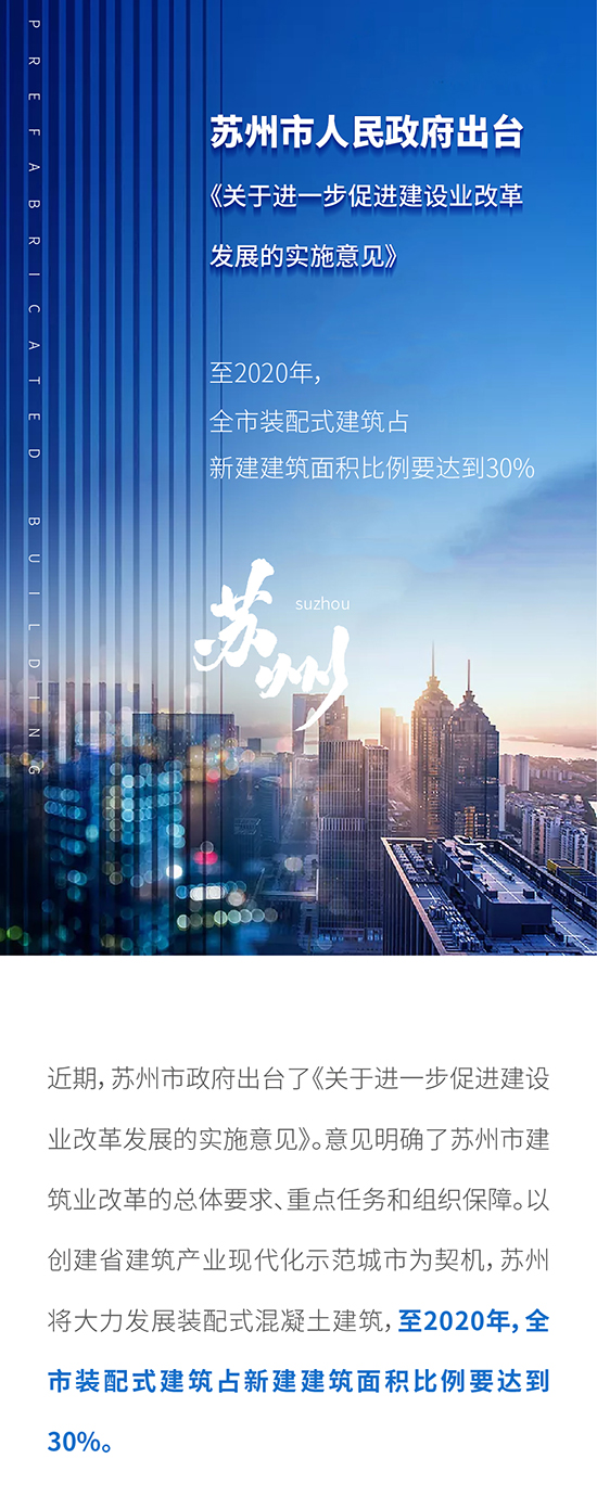 蘇州市人民政府出臺《關于進一步促進建設業改革發展的實施意見》: 至2020年,全市裝配式建筑占新建建筑面積比例要達到30%
