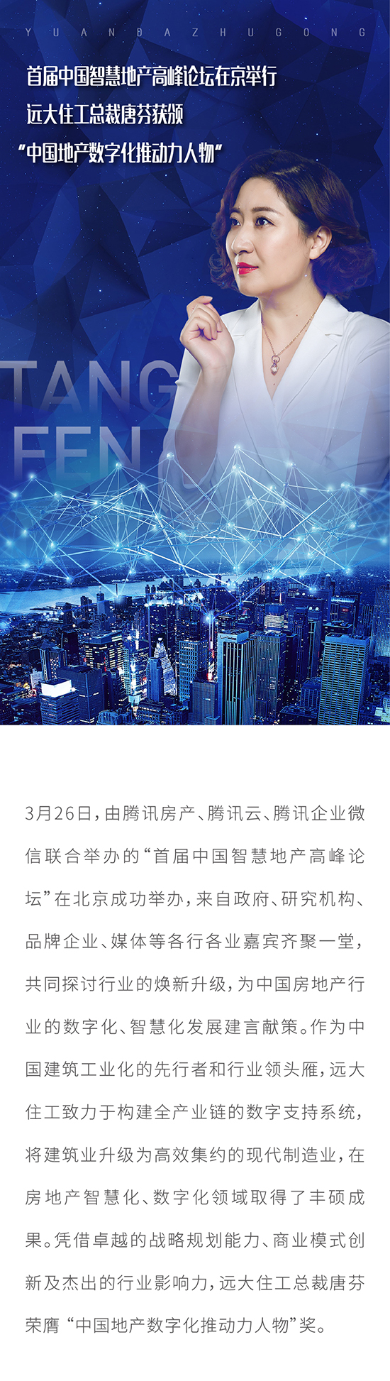 首屆中國智慧地產高峰論壇在京舉行 遠大住工總裁唐芬獲頒“中國地產數字化推動力人物”